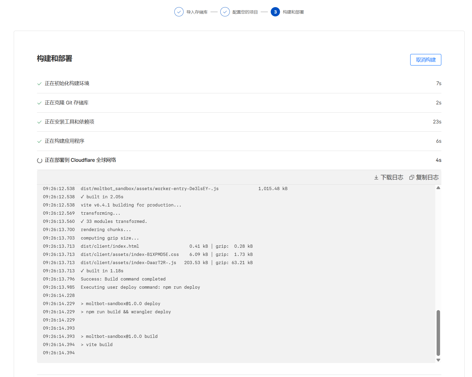 moltbot-sandbox。 - 域名可使用 Cloudflare 分配的 worker 域名或自定义域名。
