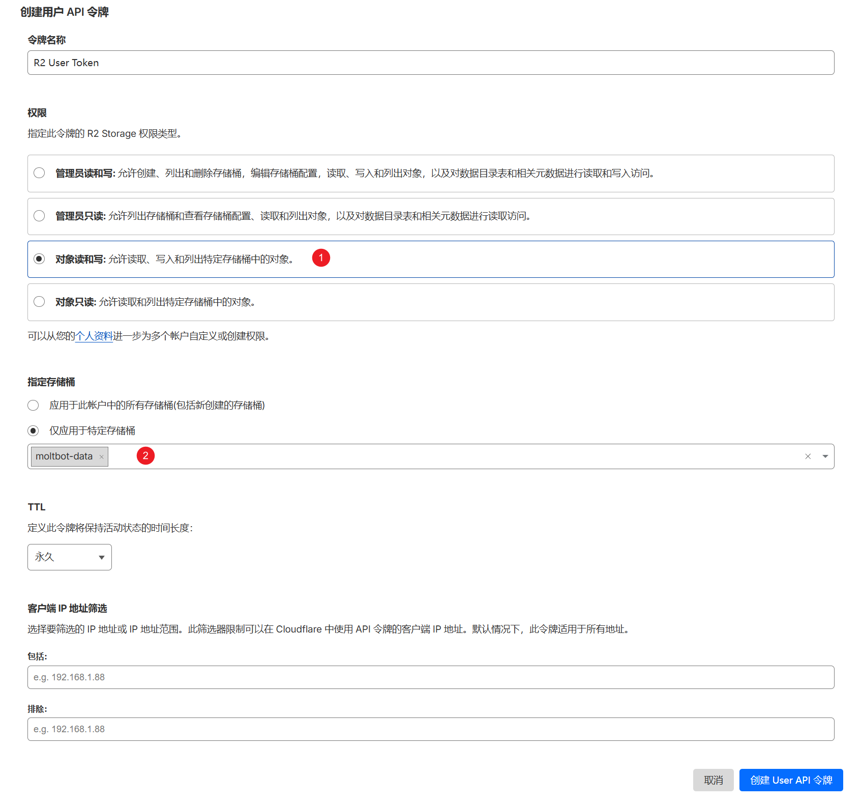 OpenClaw 需要 R2 来存储状态,需配置以下三个变量:
