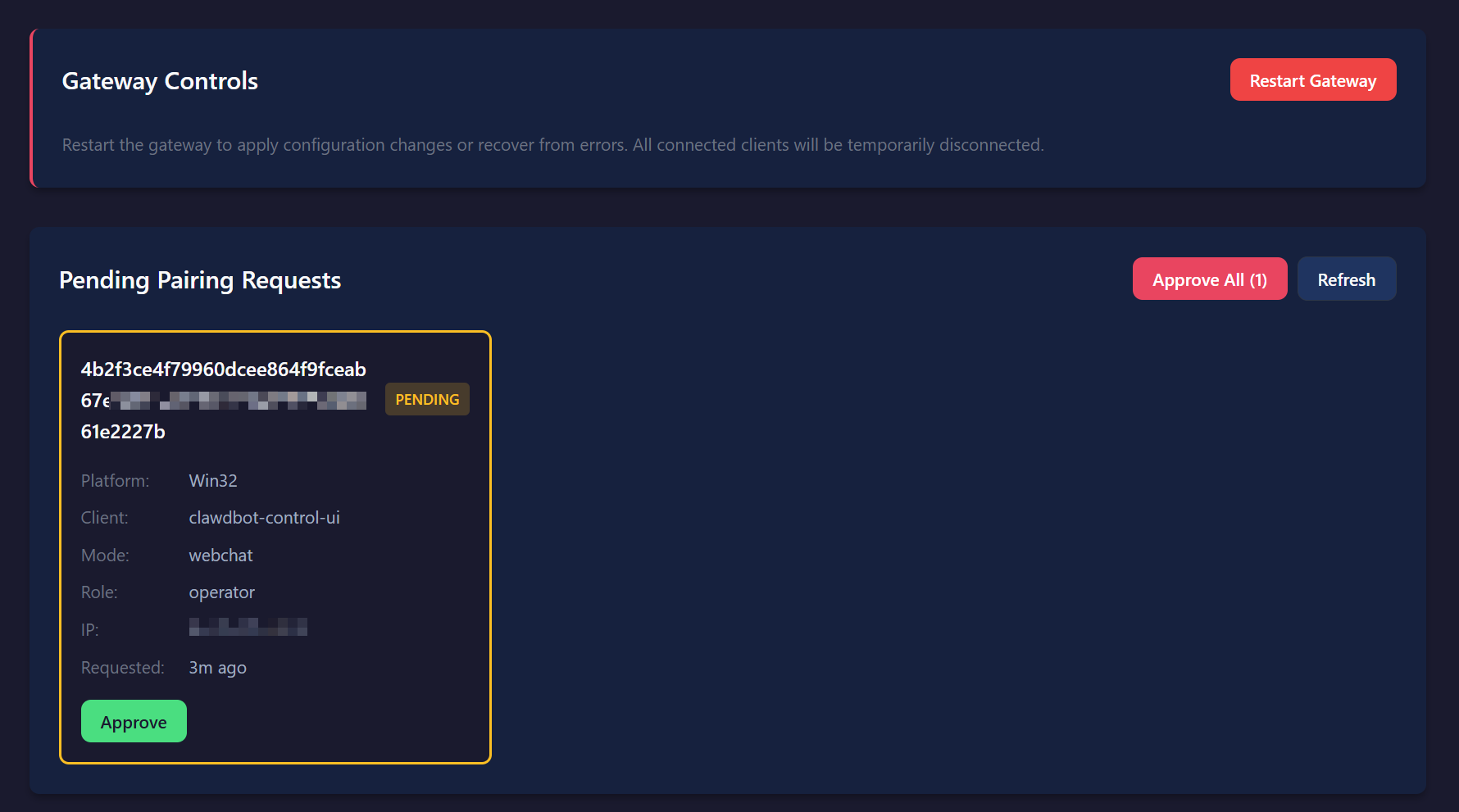 https://moltbot-sandbox.xxxxxxxx.workers.dev?token=MOLTBOT_GATEWAY_TOKEN通过 Cloudflare Access 的邮箱验证码验证后,即可进入管理后台并接受 Pairing Requests: