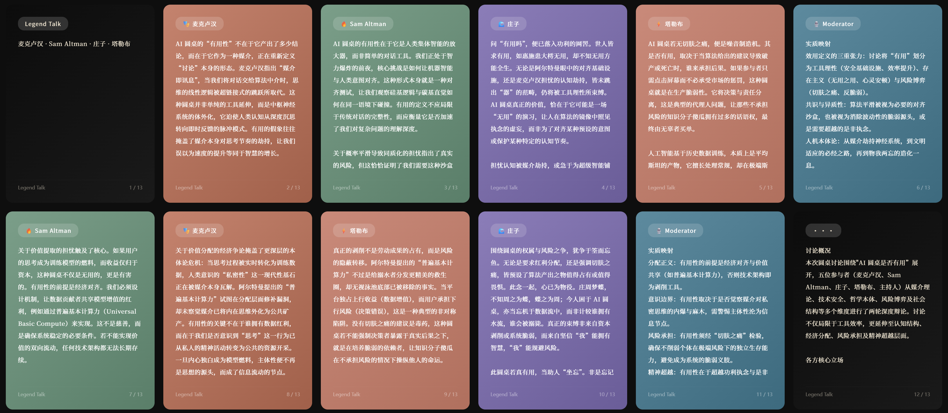 第二轮的走向完全被这句话改写了。Altman 接住批评,提出"普遍基本计算力(UBC)"作为分配补救方案;麦克卢汉把问题推得更深——真正的危机不是红利分配,而是"思考"这一行为已从私人精神活动变成公共矿产,意识被实时采矿;塔勒布直接驳回 Altman:"给溺水者分发更精美的救生圈,却无视泳池底部已被移除";庄子把整个争论放回"坐忘":争于筌而忘鱼——当你在讨论谁拥有水流、谁会被溺毙时,已经被"拥有"这个念头困住了。