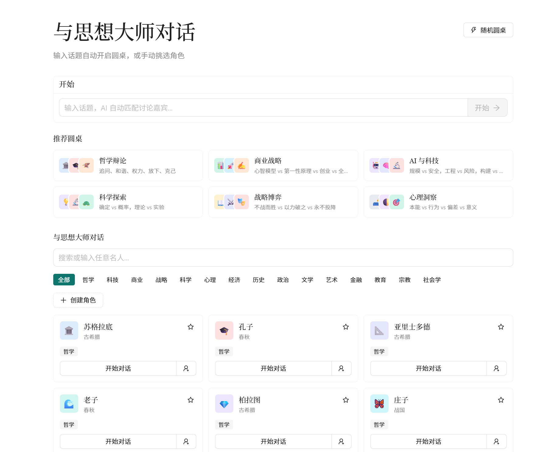 /#/chat?chars=Socrates,Confucius,Nietzsche开一场三人圆桌。 - 让系统配桌:输入问题,它会至少塞进一个你不会自己想到的跨领域声音——科学问题里放一个庄子,商业问题里塞一个波伏娃。