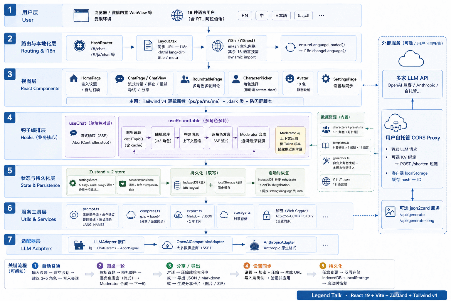 Legend Talk 是 365 开源计划的第 002 号项目,MIT 协议开源,纯前端无后端。接入自己的 API Key 即可免费使用,支持 DeepSeek、OpenAI、Anthropic 等主流大模型,也可接入 Ollama 等本地模型;讨论可一键分享,设置可加密导出。
