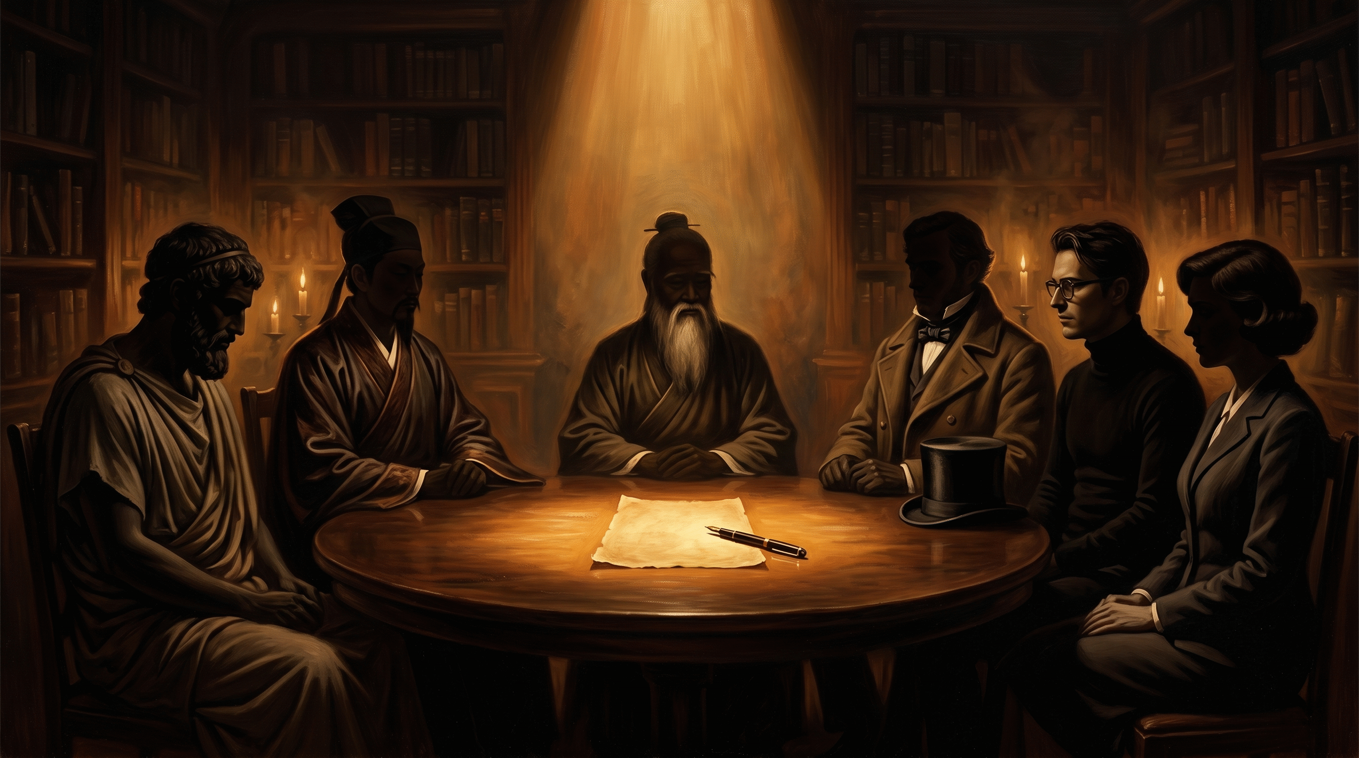 想象一下:孔子在炉边煮茶,身边的苏格拉底正揉着太阳穴准备发问。芒格和塔勒布占了靠窗的位置,小声争论一件听不清的事。角落里庄子一个人站着——他对所有热闹都保持距离。张一鸣坐在笔记本前写东西,对面的乔布斯盯着他看。马斯克站在黑板前画图,波伏娃看着那张图,似乎不太赞成。